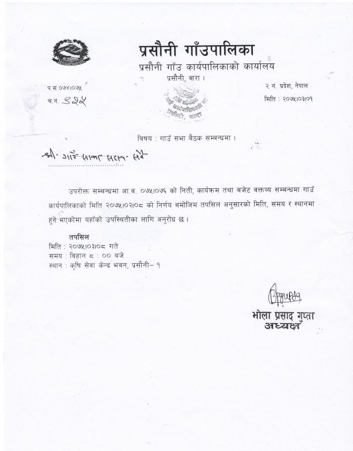 अा.व.०७५\०७६ काे गाउँसभा बैठकमा तपसिल अनुसारकाे िमति ,समय र स्थानमा हुने भएकाेमा यहाँकाे उपिस्थतीका लागि अनुराेध छ ।