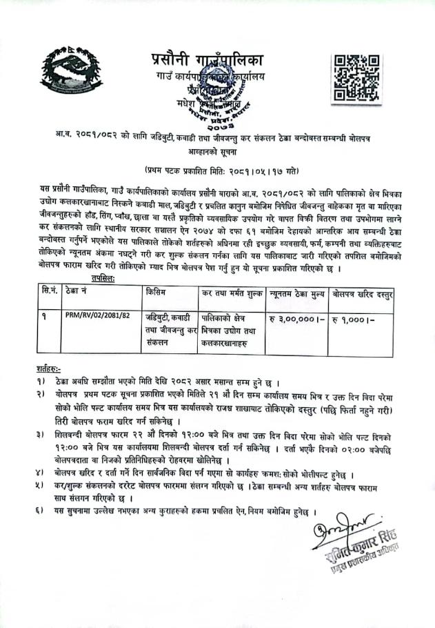 » जडीबुटी, कबाडी तथा जीवजन्तु कर संकलन ठेक्का बन्दोबस्त सम्बन्धी बोलपत्र आह्वानको सूचना ।