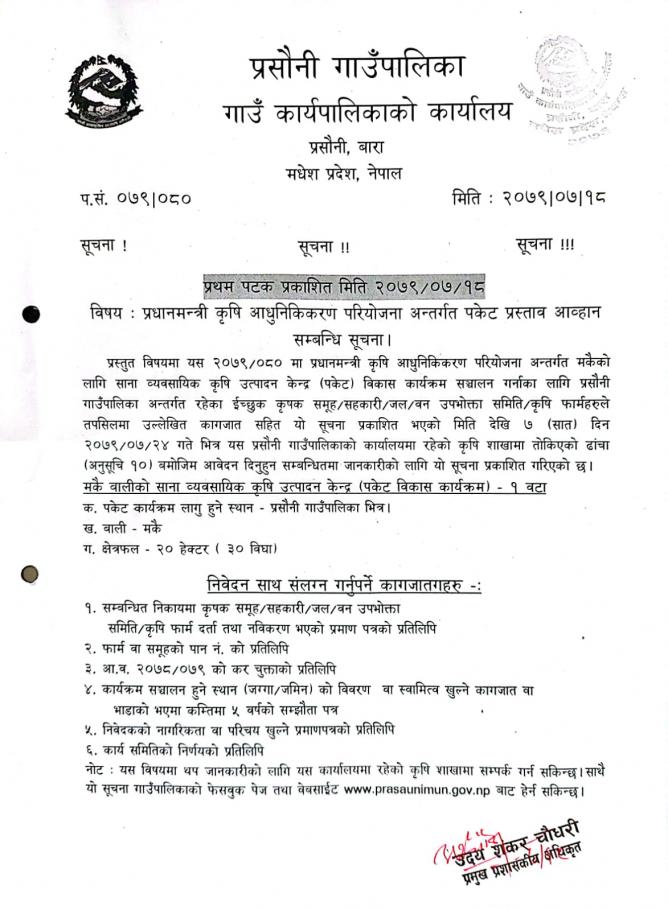 प्रधानमन्त्री कृषि आधुनिकिकरण परियोजना अन्तर्गत पकेट प्रस्ताव आव्हान सम्बन्धि सूचना ।